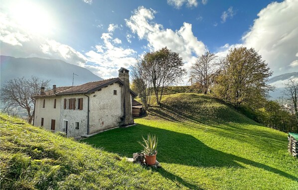 Dette hyggelige feriehus falder smukt ind i det grønne, bjergrige landskab.