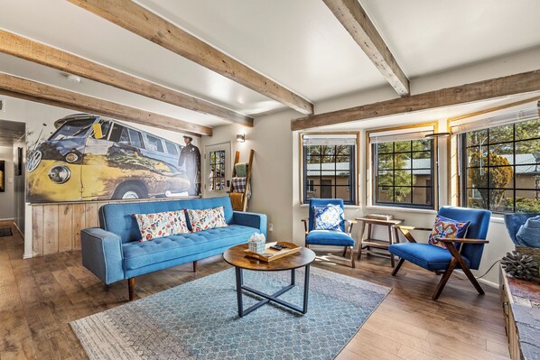 The living room and bedrooms have Samsung Smart TVs with speedy streaming 1-gig Wi-Fi access. The living room is comfortable with a sofa and two club chairs. It boasts a fireplace, a record player, board games, and a small library.