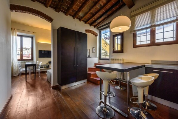 Immersed in the roofs of the city, the apartment offers a breathtaking view that you can admire from the small terrace. Here you can enjoy a coffee in the morning or a glass of wine at sunset, admiring the city of Florence.