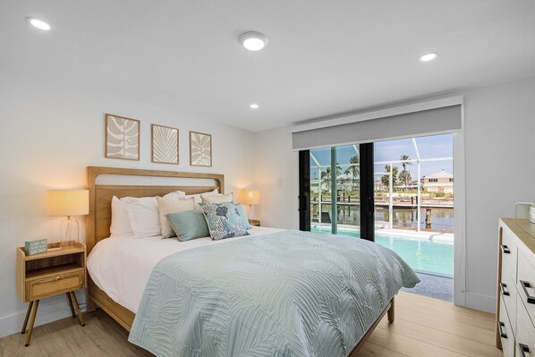 1 Bedroom with a Queen Size Bed, has a Sliding Door to enjoy the Water and Pool view and a 50" Smart Tv Sofabed in the Living Room with a Queen Mattress
