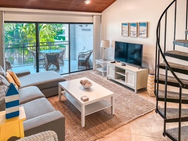 Recently remodeled stunning and spacious! This 2 bedroom, 2 bath is on the second floor of a building without an elevator. The living room is elegant and spacious with vaulted ceilings a large flat screen TV, and plenty of seating. There is with an adorable loft complete with writing desk and angled nook that contains a twin sized bed. The kitchen is upgraded with granite counter tops, all black appliances and ample dishes. The tiled living room offers a dining room table for 6. Master bedroom offers a Queen-sized bed, flat screen television, hard wood flooring with balcony access. Master bedroom En suite has walk in shower. Second bathroom has a tub/shower combo. The Guest bedroom is equipped with 2 Full sized beds, a flat screen television and hard wood flooring. This unit features a full-sized washer/dryer, cable and internet. All of the wonderful amenities at Ocean Village are included with this rental. All of the available amenities at Ocean Village are included with this rental.
