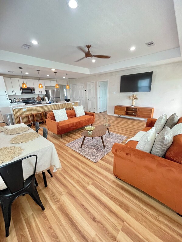 Experience modern furnishings along with a Smart TV in both the living room and the master bedroom. Log in to your Netflix, Hulu, or YouTube TV accounts to catch up on your favorite shows. Gather everyone for a fun game night and enjoy some popcorn—these little moments make a vacation truly special. TulumSurfside provides many comforts, including hair dryers in the bathrooms, free Wi-Fi, and both ice-cold air conditioning and ceiling fans to keep you cool. Additionally, there is an in-house washer and dryer for your convenience.