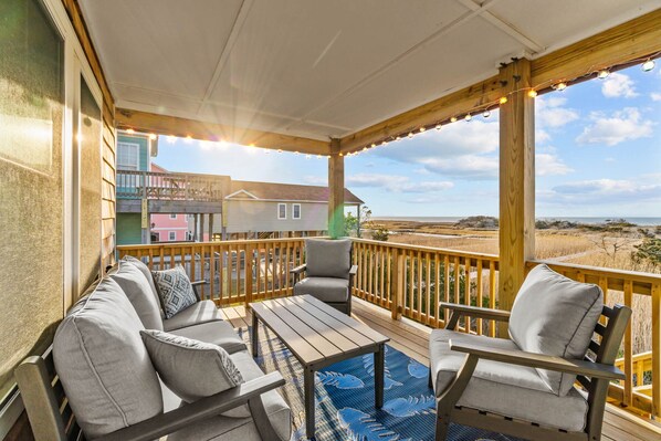 All of the home’s bedrooms, including an ensuite master king and a queen and full bedroom that share a bathroom, are located on the second level and all feature Smart TVs. Here, too, a wide-open living area offers plenty of space to bring everyone together for prepping meals in the spacious and well-equipped kitchen; long family dinners filled with laughter around the six-seat dining table; or as you settle in for the evening around the Smart TV. Better yet, settle into the new furnishings outside on the deck as the sunset gives way to a starlit sky. You won’t want to let another day go by before booking SOUNDSIDE SUNSETS!