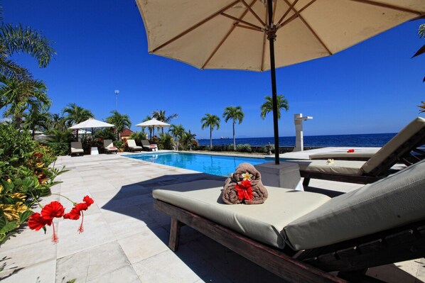 Privat pool med liggestole og parasoller.