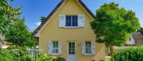 Stråtækt sommerhus til 8 personer med en udendørs pool, tæt på stranden og skoven, sauna