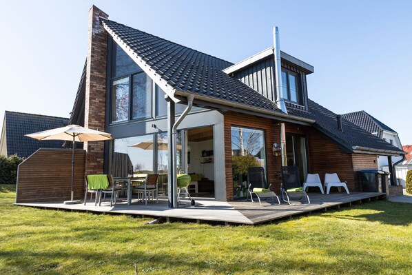 Solterrassen med tilstødende have lover afslappende timer med uhindret udsigt. I kort gåafstand kommer du til flodenens flod og kan nyde en forfriskende dukkert i søen. Med en sundowner på komfortable havemøbler (havebord, 4 havestole, 2 strandstole, parasol) vil du helt sikkert opleve en dejlig aften. Du kan tilberede lækker grillet mad på WEBER-kullgrillet (tag med grillkul) i terrassen. Lad sjælen dingle og nyd en afslappet atmosfære i en eksklusiv, god atmosfære i hver sæson.