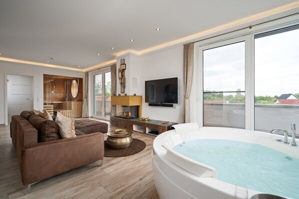 Stue og spisestue: - Indendørs jacuzzi med LED-belysning - Åben planløsning med hjørnesofa og adgang til tagterrassen - 50 tommer fuld HD fladskærm (+ SKY TV: Bundesliga (begrænset), golf turneringer, aktuelle film i HD -Quality) + Soundbar - Høj kvalitet gas pejs i stuen - Åben spiseplads med spisebord og 2 stole