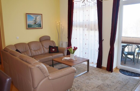 Den 2-værelses komfortlejlighed ligger i en rolig, men central beliggenhed og har en stor balkon med udsigt over Østersøen. Lejligheden er opdelt i et soveværelse med dobbeltseng, klædeskab og tv, en stue med en stor komfortabel sovesofa og et stort fladskærms-tv + dvd-afspiller og læsning materialer. En Middelhavs badeværelse med brus / toilet og hårtørrer. Det rummelige køkken er fuldt udstyret med ovn, opvaskemaskine, mikroovn og mange ekstra - en ekstra spiseplads er i tillæg til køkkenet. Vaskemaskine er til rådighed i lejligheden. Direkte ved huset er der en parkeringsplads (nr. 2). Barneseng til rådighed! En linnedpakke bestående af sengelinned, håndklæde, to håndklæder, bademåtte og tehåndklæde kan lejes til € 15,00 / person. Bemærk: Ved afgang på søndage og helligdage skal der reserveres et tillæg til slutrengøring.