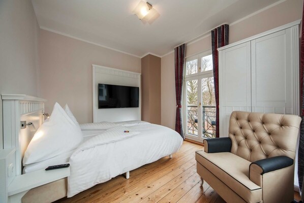 "Feriefølelse på 2 etager" Det maritime anlæg viser dig, hvor du er - i huset til kaptajn Grahl. Kaptajnens svigerfar havde en gang denne bygning bygget som gæstepension. Kaptajnen var en rigtig velhavende mand på det tidspunkt, og denne lejlighed ville have tilfredset ham. På 61 m² over 2 etager kan 4 personer tilbringe afslappende ferie. På den sydlige terrasse går du ind i køkkenet med spisebord. I det nedre område er der et soveværelse med dobbeltseng og badeværelse med bruser, toilet og håndklæde radiator. En tral spiral trappe fører til øverste etage, hvor der er et andet soveværelse med en dobbeltseng og et fladskærms-tv. Laue sommernætter kan nydes på den private terrasse mod syd.
