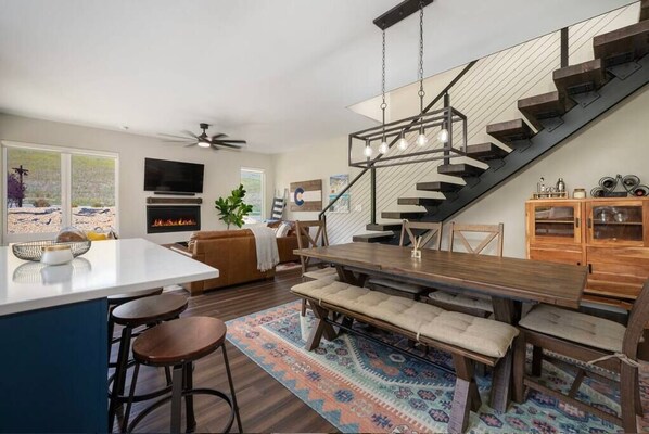 The dining area is perfect for enjoying a meal with your group and guests. The indoor dining table has enough chairs for 6 guests!