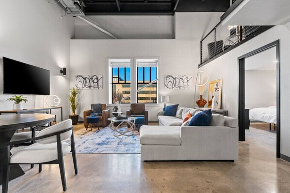 Enjoy this stylish, 3-bedroom, 2 bath downtown loft. This rare find has it all: city views, soaring ceilings, modern decor, & fully equipped kitchen. Kick back on our sprawling sectional, tune in to the game on our 60” Hisense TV, or cozy up with a book in front of our electric fireplace in the loft. This modern space boasts a king, queen, (2) twin beds, & in-unit washer/dryer combo. Enjoy free access to our community room, rooftop patio, and gym. FREE shuttle to/from Lambeau on game day.