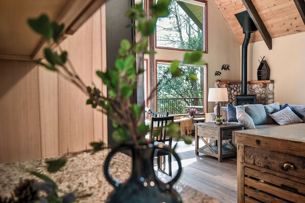 Step into an inviting cabin space featuring rustic wood accents and a spacious open floor plan. The living room offers a cozy spot to gather, with plush seating, large windows for forest views, and a fireplace perfect for chilly mountain nights. You’ll find a fully-equipped kitchen with everything needed to prepare your favorite meals, which can be enjoyed in the dining area or out on the expansive deck overlooking the pines.