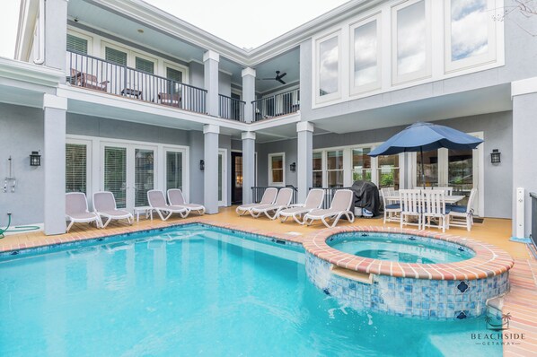 Just upstairs are the remaining four bedrooms and another living room. This additional space allows everyone to spread out or come together, whichever you’d like. The first guest bedroom features 2 queen beds and an en-suite bathroom. The next guest bedroom has a king bed and en-suite bathroom. This king bedroom also contains access to a patio overlooking the pool. This side covered porch is perfect for enjoying your morning coffee and ocean breeze. Just down the hall is the upstairs living room with a large flat-screen TV, plenty of seating, and room for the whole family. The next guest bedroom features a king bed and en-suite bathroom with a shower. The last guest bedroom off the living room also features a king bedroom and en-suite bathroom. Upstairs there is a 2nd laundry room as well.