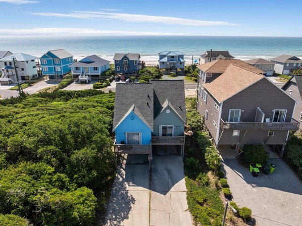 The attached deck off the living area invites you to relax and unwind with ocean views as your backdrop. Whether you're enjoying a quiet morning coffee as the sun rises over the water or gathering with friends for an evening cocktail, the deck offers a front-row seat to the sights, sounds, and salty breeze of the sea. Just steps away, direct beach access across the street makes it effortless to dip your toes in the sand or take a morning stroll along the shoreline. For your convenience, beach chairs and a wagon are provided, so you can easily pack up your essentials for a perfect day by the water.