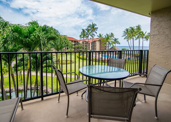 Tag i den storslåede udsigt over Stillehavet, med Molokai og Lanai i afstanden, fra lanai af denne lejlighed beliggende i bygning G. Denne enhed tilbyder tæt på havet, koi damme, putting green, opvarmet pool og boblebad. Nyd din morgenkaffe og strålende solnedgange fra komforten af din private Lanai.