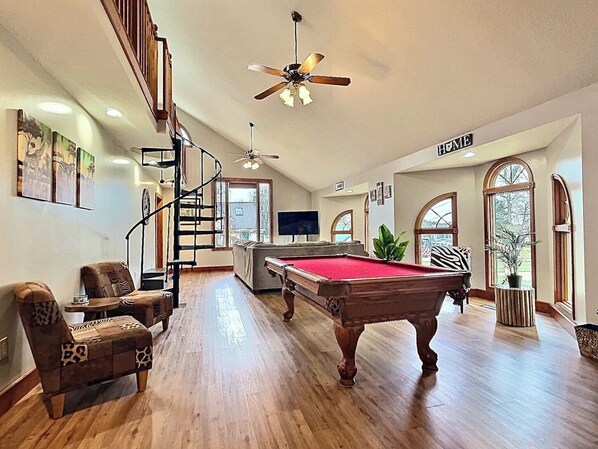 Whether you seek adventure or pure relaxation, the Castle on the Lake delivers! Unwind in cozy corners or indulge in endless entertainment options. Challenge friends on our handcrafted pool table, enjoy a card game with stunning lake views, or relive nostalgia with a retro arcade game. Savor meals in multiple dining spaces, then relax on a luxurious sectional for a movie night. With hundreds of feet of windows showcasing breathtaking Lake Erie views, every moment is unforgettable!