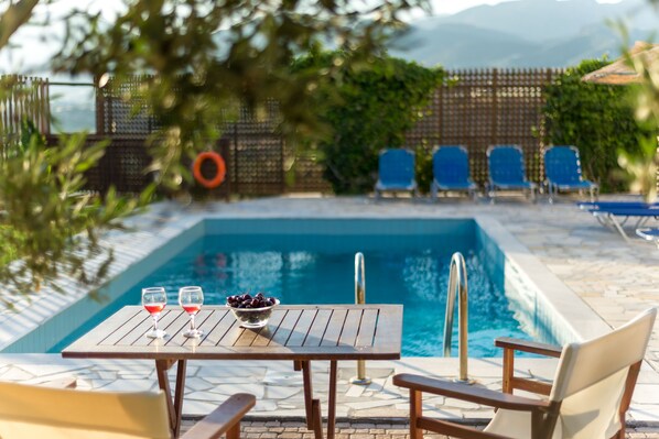 Incredible views of the coastline, with very flexible accommodation which was very welcome as we were 4 households and we needed a villa with no bathroom sharing or having to sleep on sofas. 3 upstairs rooms have large balconies and one double room downstairs. Also a further room which had a double room but also two singles, in a separate area downstairs, ideal for a young family. The pool area is lovely, but the pool is quite deep both ends, so I would not recommend for children who need a shallow end to paddle. 10 minutes drive into Markry Gialos and lots of small supermarkets, superb bakery, pharmacy, large free car park with access to a sandy beach and lots of restaurants along the harbour. A car is essential because you a perched on a hill and feel as if you are at the end of the island. Absolutely magical. Our host was easy to contact which was lucky as we managed to lock ourselves out by the pool one evening, the back door only opens with a key, so don’t leave it inside like we did, then a gush of wind slammed it shut! She came within ten minutes to rescue us and unlock the door. There’s two kitchen areas, a small one upstairs which we didn’t use as we all ate breakfast together downstairs and then we were out most days all day. There’s lots of Tupperware which was great to stop the ants getting into open packets. Air conditioning was good, Wi-Fi did come and go, but was good most of the time. 4G signal strong though so you get a good signal. Good value accommodation.
