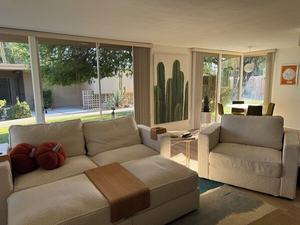 Watch the golfers putt from the living room and patio! Walls of glass sliding doors make the space light and bright. This Bermuda Dunes condo sleeps 4 plus one to two on sofa couch, (over 1200 sq. ft) There are 2 bedrooms and 2 bathrooms with 1 king bed and 1 queen bed (with new Casper mattresses). The cozy living room with new down filled modular sofas (with Bedding Kit) offers awesome relaxation and extra guest sleep space. This home is also steps from a large pool with a spa.