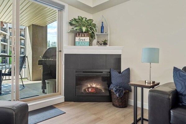 The living room features a fireplace, a Smart TV with cable, board games, and cozy seating options to kick back on after a day filled with adventures.