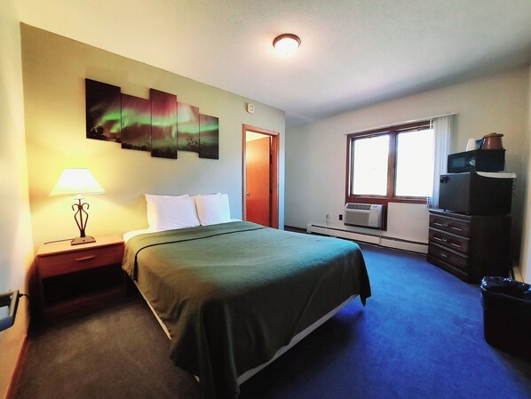 This guestroom is a corner room with both a street and a northern view. Look carefully on Aurora evenings, you may catch a glimpse of the dancing lights across the sky! Two bedrooms and two bathrooms. Two QUEEN beds. Bedrooms are separated by a short, narrow hallway allowing some privacy between beds. Great for families or groups of 2-4. Includes one 37" flatscreen TV in second bedroom, one microwave, dorm style refrigerator and 4-cup coffee maker.