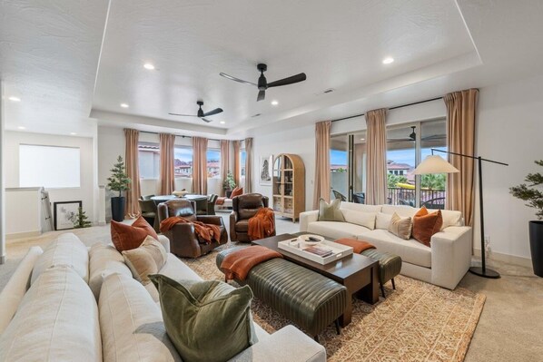 Ovenpå finder du et kæmpe vidunderligt familieværelse. Familieværelsen har en enorm lædersektionssofa og et stort fladskærms-tv. Der er et stort spillebord med plads til op til otte. Super sjovt rum til nogle familiespil. Udenfor er det andet overdækkede udendørs opholdsrum med en polstret sofa, sæde og plads til 4 mere. Nyd udsigten til den smukke Snow Canyon, og den ser også ud over det fantastiske feriested med poolområdet. Bedste udsigter i denne flot udvikling. Øverst på trappen er en dejlig kingsize-seng i det første soveværelse, der leveres med et tv og et bad i fuld størrelse. Køjerummet er en børnedrøm. To indbyggede sæt med to køjesenge (træk dobbeltvalser) med tilsluttende trapper imellem, en dobbeltdagsseng til alsidig brug og et tv. Dette værelse kan sove op til 7. Det private bad til dette soveværelse gør det til en ideel situation for de små. Der er et andet stort elskede soveværelse med to dronningssenge, og selvfølgelig har dette soveværelse også et tv. Et komplet badeværelse i dette soveværelse gør 6 til hele huset.