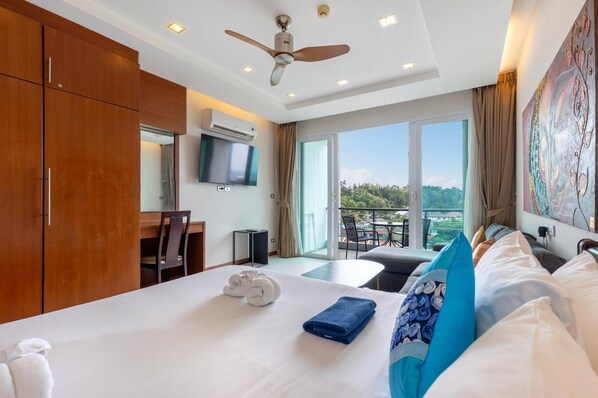 This studio is designed for relaxation, featuring a comfortable queen bed, a seating sofa, a wardrobe, and a dressing table. Floor-to-ceiling windows flood the space with natural light and open directly onto your private balcony—the perfect spot to soak in the sea breeze and beautiful ocean views with your morning coffee.
