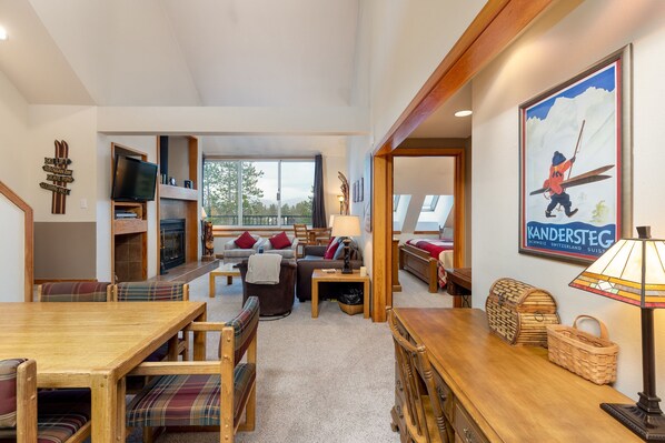 Den dejlige stue har kommanderende og endeløs udsigt over Buffalo Mountain, Gore Range, Ten Mile Range og Keystone Golf Course nedenfor. Soaring lofter vil næsten tvinge dig til at nyde de to queen size pull out sovesofaer foran det nye 40 tommer fladskærms-tv, DVD / VHS-afspiller eller foran din helt egen ægte brændeovn. Gratis brænde er endda leveret direkte til din pejs ildsted! Der er et VHS og DVD bibliotek og et brætspil eller puslespil valg til din nydelse. Den charmerende skiindretning vil føle dig som en pro bjergbestiger i dit eget hjem.