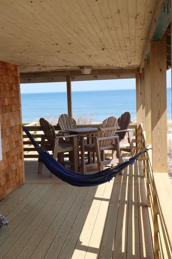 Lemonade cottage har en åben opholdsstue med højt hvælvet loft, ægte tunge-og-rille paneler, rustikke trægulve, masser af naturligt lys og panoramaudsigt over havet fra overdækkede og afdækkede verandaer og dæk. Stuen med komfortable siddepladser, et stort fladskærms-tv og loftsventilator er der, når du er klar til en pause fra din baghavsstrand. Ved siden af opholdsstuen ligger spisestuen med et antikt spisebord, siddepladser i kirken og væg-til-væg-vinduer med udsigt over Atlanterhavet. Nyd din morgenkaffe, mens du ser delfinerne lege i brændingen og solen stiger op på Atlanterhavet. . . du vil aldrig komme ud af dine PJ'er.