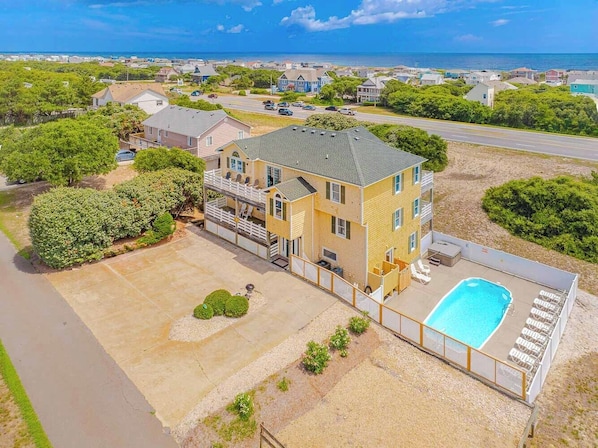 At the Beach or on the Links, this custom built Kitty Hawk Beach home has it all! Located on the 2nd Fairway of Sea Scape Golf Links this very spacious and beautifully decorated home offers panoramic views of the ocean and golf course and boasts a wide array of amenities to ensure your families enjoyment including a Large Private Swimming Pool, Hot Tub, and Rec. Room w/Pool Table.