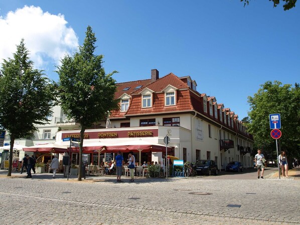Centralt beliggende er det også et stenkast til de andre zalreichen restauranter i strandvejen sådan. B. Den italienske restaurant "Gallo Nero" og Ostseebrauhaus eller gourmetrestauranten "Wilhelms" lige overfor. En seafood restaurant og en græsk restaurant, samt mange andre bagerier, er i umiddelbar nærhed. Samt talrige caféer, butikker og butikker til daglige behov.