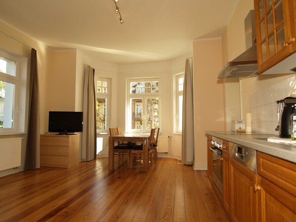 REKREATIONSREN I EN STILLET CENTRAL BELIGGENHED - IKKE LANGT FRA HAVET Villastrandsolen i Friedrich-Borgwardt-Straße 16 blev bygget omkring 1900 og nænsomt restaureret i 2009 og totalrenoveret. I de fire lejligheder finder du de restaurerede trægulve, der giver hele huset en unik charme. Den nedenunder er også en sauna med afslapningsrum, der er til rådighed for et gebyr på 8 euro. Bilaget har en åben men overdækket fælles opholdsstue. Lejligheden har en parkeringsplads. Du kan parkere dine cykler i et aflåst værelse. Vores tip til cykelvenner - Cykler udlejes til særlige betingelser: Har du altid drømt om at cykle til stranden? Vil du gerne besøge en af de mange on-site begivenheder på cykel? Eller vil du være lidt sporty og gøre en opdagelsestur på cykel på det veludviklede cykelsti netværk i området? Ligegyldigt hvad dit hjerte ønsker: I cykeludlejningen MIN HJUL ved havet kan du på særlige vilkår (rabatkuponer, du modtager ved ankomsten) cykler, e-cykler, børnecykler, mountainbikes u. V. M. låne.
