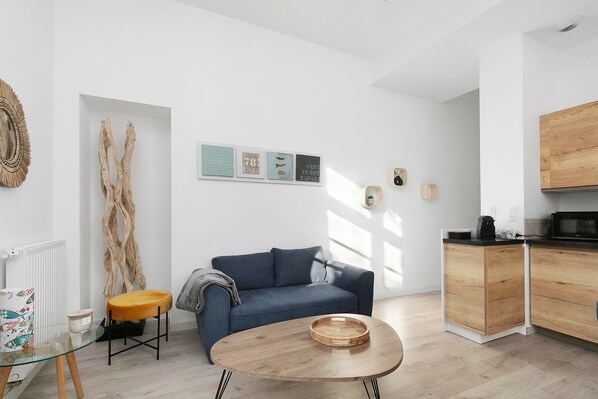 The apartment is in the city center, just a 10-minute walk from the train station, close to shops, the beach, and the local market. Set in the former Public Treasury building, it combines historical charm—high ceilings—with modern comfort in the heart of La Baule.