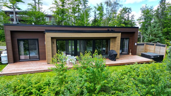 The large deck in the rear of the chalet has a hot tub barbecue grill and patio furniture. It’s the perfect setting to enjoy a meal with family.
