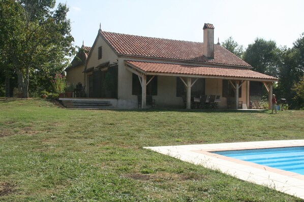 Huset nærmer sig en lang køretur, beliggende midt på sin egen 20 hektar store grund med en privat, pool, frugtplantage, marker og vinmarker - der er masser af plads til børn at udforske og voksne til at slappe af. Den 11 x 6 m private pool er udstyret med en poolalarm. Solterrassen med udsigt over poolen vinker soltilbedere til at nyde deres garvning, mens de holder øje med børnene.