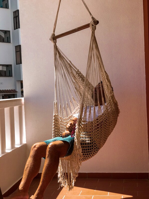 A highlight is the balcony, accessible from every room, where you can unwind in a hammock chair while taking in the scenery. The artificial grass flooring creates a unique, inviting atmosphere—perfect for lounging barefoot and feeling at home.
