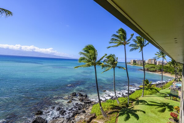 Denne utrolige havfront og airconditionerede suite har to private lanaier (en ud af stuen og den anden ud af soveværelset) hvor du kan nyde hvalsafari, spektakulære solnedgange og endeløs havudsigt. Begge lanai har bord og komfortable stole til at slappe af i løbet af dagen eller aftenen. Lejligheden har et rummeligt fuldt udstyret køkken med masser af bordplade og moderne rustfrit stål apparater. Køkkenet er fyldt med køkkengrej, tallerkener, briller, stemware, redskaber og meget mere, så du kan lave dine yndlingsmåltider. Lige ud af køkkenet er der et separat spiseplads med bord og seks stole. Det er det perfekte sted for underholdende! I stuen er der hævede lofter med forsænket belysning sammen med en elegant ø-indretning og et stort fladskærms-tv. Udsigten over havet fra stuen er spektakulær!