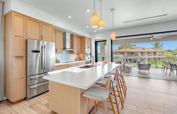 Sliding pocket doors open to reveal a massive 500+ sq ft lanai with an abundance of lounging and dining space. An outdoor kitchen area comes complete with its own private BBQ grill. Enjoy the gorgeous Maui outdoors all day long, because Luana 8C features an upgraded retractable sunshade, offering privacy, wind protection, and added safety for younger guests.