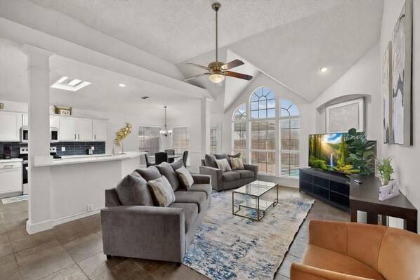 The Space Step into a bright, open layout with modern finishes and comfortable furnishings throughout. 4 spacious bedrooms with comfortable beds Bedroom 1: King bed with nightstands, dresser + 65" smart TV Bedroom 2: Queen bed with nightstand, dresser + 50" smart TV Bedroom 3: Two double beds with nightstand, chest + 50" smart TV Bedroom 4: full over full bunk bed+ twin over twin bunk bed