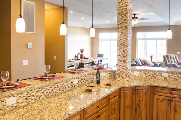 Placeret på hovedindgangen er vores store familieværelse, en propanpejs og de mest komfortable møbler, du kunne forestille dig til at se det store LED Smart TV. Det ultramoderne køkken er perfekt til madlavning til store familier med sin rummelige morgenmadsbar i granit. Køkkenet har alt hvad du har brug for og er fuldt udstyret med alt opgraderet køkkengrej, et køleskab side om side, en keramisk komfur og ovn og en mikrobølgeovn, der er uden for området. Vores spiseplads har et specialdesignet massivt træbord med matchende siddepladser, der er placeret for at drage fordel af udsigten over søen. Der er to dronning soveværelser på denne etage, hver med et tilknyttet badekar. Dette er den perfekte opsætning til en bedsteforælder, der ikke vil have en masse trapper.