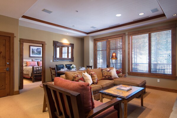 Denne luksus to værelses ejerlejlighed er bekvemt beliggende i Iron Horse South bygningen i hjertet af landsbyen på Northstar. Denne smukt indrettede tredje etage bopæl har en åben grundplan og har et gourmet køkken med rustfrit stål apparater og granit bordplader. Boligen har et fladskærms-tv over gas pejsen og en udendørs terrasse. Med et soveværelse med king size-seng, en dobbeltseng og en fuld seng i det andet soveværelse, en dronning sovesofa og et rummeligt andet badeværelse med dobbelt forfængelighed, er der masser af plads til at være vært for venner og familie efter en spændende Tahoe eventyr.