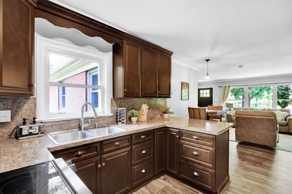 Fully stocked and ready for your culinary creations, the kitchen includes a full-sized refrigerator and freezer, glass-top stove with oven, and a wide range of appliances. Enjoy your favorite brews with a Ninja coffee maker that includes both drip and K-cup options. You`ll also find a blender, toaster, rice maker, and an abundance of cookware, bakeware, utensils, and basic spices—everything you need to prepare a home-cooked meal.