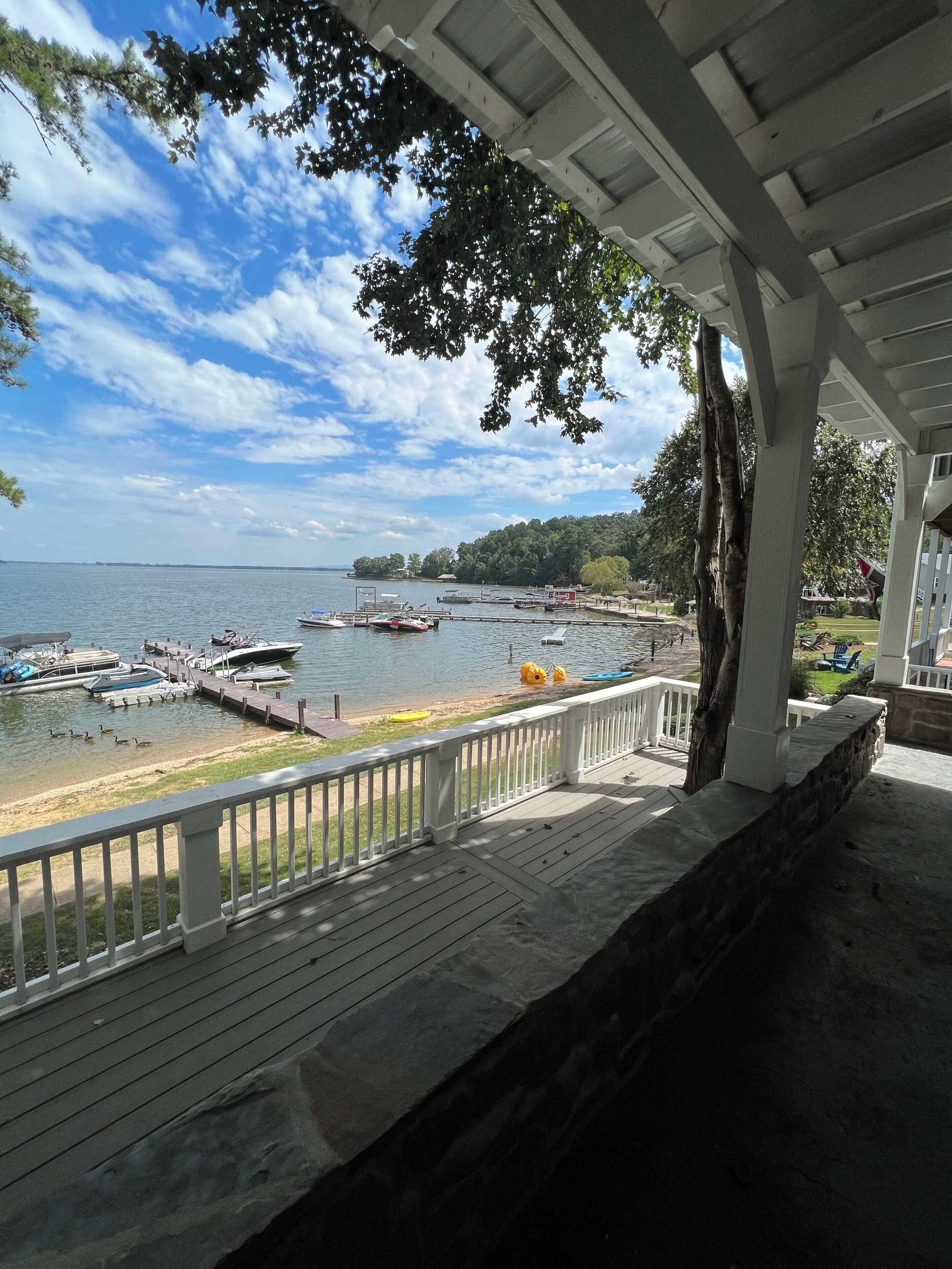 Covered deck with outdoor dining furniture and rocking chairs facing the lake; covered screened-in-porch facing the pool; lower-level patio with dining furniture with direct beach and lake access; private boat dock with Adirondack chairs and table extending into the lake
