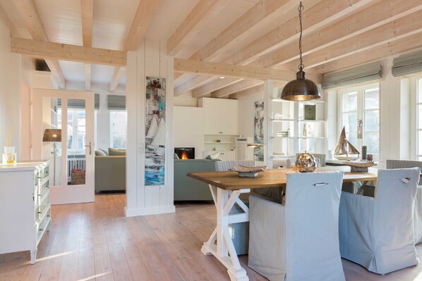 Huset "Lister beacon" huse i en pæn, hvid murstensbygning med hårdt tag en rummelig, 190-kvadratmeter lejlighed i Beach House stil til din Sild ferie med op til seks personer. Hele enheden er let og lyst med masser af træ, hvide garderobeskabe og lyse ægte træ planker. I stueetagen har en rummelig stue med tilst��dende spisestue og åbent køkken. Den moderne tv med satellit modtagelse og fremragende Bose lydsystem er pænt skjult i anlægget. I stuen pejsen til romantiske stemning gør. Det store køkken er adskilt fra den rummelige spisestue med en morgenmad bar. Alle bekvemmeligheder af et moderne køkken fra brændeovnen på mikrobølge op til køleskab og fryser og opvaskemaskine er til rådighed. Fra stuen og spisestue du kommer til de to terrasser. Køkkenet tilbyder en anden adgang til haven. Også fundet i stueetagen, et gæstebadeværelse og et påklædningsværelse. Den første sal tilbyder en elegant udseende med hvide træpaneler. Ovenpå er der et lyst og rummeligt badeværelse med badekar og rummelig bruser, dobbelt håndvask og toilet. I det første soveværelse er der en 2 x 2 meter store kasse foråret. Det andet soveværelse har en 1,60 x 2,00 meter store dobbeltseng, et lille skrivebord og eget badeværelse med toilet og separat vaskerum med vaskemaskine. Den tredje soveværelse har en trille seng til en eller to personer, et skrivebord og et tv. Alle værelser har indbyggede skabe og tilbyder en vidunderlig udsigt over havet og naturen. Uden for døren er der to parkeringspladser og en indgroet, hyggelig have med to terrasser og en strand stol. En rummelig have hus giver rigelig plads til cykler og til hyggelige grillaftener i Sylt-ferie er en førsteklasses Weber grill.