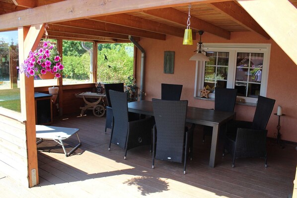 En stue med åbent komfortable køkken, 2 soveværelser hver med en dobbeltseng placeret på den nederste etage af huset. En anden lille soveværelse med en enkelt seng kan nås ovenpå og en vindeltrappe. Et badeværelse med bruser / toilet og bad er til rådighed. Huset har 6 personer (med en belægningsprocent på 6 personer, enkeltseng i ovenpå sovev��relset erstattet af en dobbelt luftmadras). På den overdækkede delvist glaseret terrasse kan du slappe af efter en begivenhedsrig dag. Huset har 4 heste, 2 hunde og 6 katte. 2 cykler og en kano kan lejes. Ankomst fra 16. 00:00, afgang indtil 10 midnat.