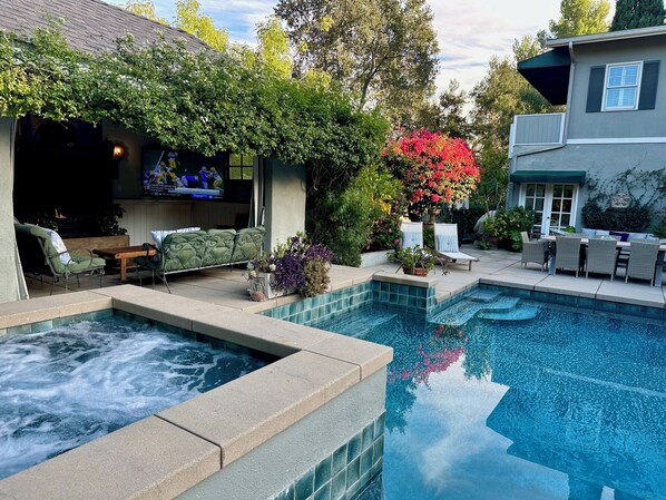 Den frodige anlagte baghave giver en fantastisk ramme for udendørs ophold. En smuk pool og spa er omgivet af springvand, et gårdsplads til udendørs spisning og en charmerende cabana med pejs, udendørs sofaer og et stort tv, der kan ses fra spaen. Hver aften eller nat skal indeholde en afslappende blød i den dejlige spa (komplet med fodstråler :), som komfortabelt har plads til 8. Om natten er baghaven magisk med accentbelysning i hele gården. Efter gæstens anmodning kan poolen opvarmes til en meget behagelig 87 grader i 4 sæsoner til nydelse af poolen om dagen og natten.