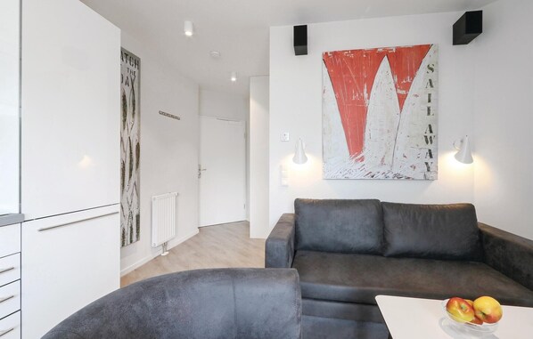 Den moderne indrettede ferielejlighed har rigelig plads til fire personer. Soveværelset har en fin dobbeltseng, og i opholdsstuen er der en sovesofa til to personer. Her er ligeledes en køkkenniche og en spiseplads. Efter en lang dag kan I hygge jer foran biokaminen, som bidrager til en hyggelig atmosfære i rummet. Altanerne kan nås enten fra soveværelset eller stuen. Her kan I sidde og spise jeres morgenmad eller bare nyde den friske østersøluft.