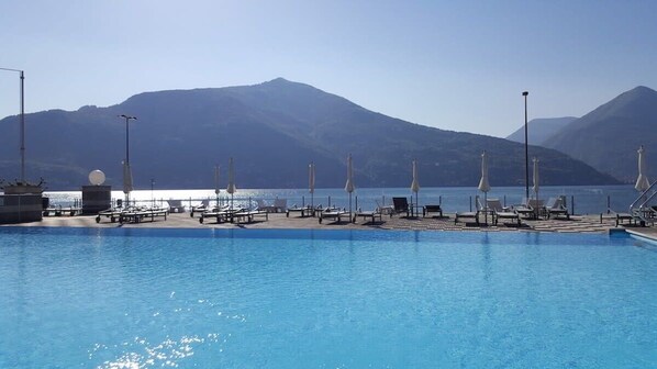Moderne 2 værelses lejlighed i stueetagen beliggende ved bredden af Maggiore-søen. Lejligheden er veludstyret, og gæsterne nyder brug af en stor swimmingpool og jacuzzi, omgivet af teakdæk og liggestole. Der er en restaurant på stedet samt en bar og cafe. Ejendommen er også inden for gåafstand af en række andre spisesteder. Der er også en strand kun få meter fra ejendommen, hvor gæsterne kan leje både, vandcykler eller kanoer.