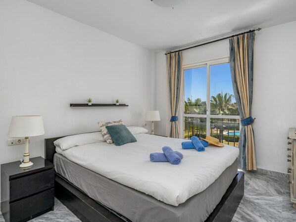 "Lorcrisur", 3-værelse-lejlighed 70 m2 i 3. etage, syd vest vendt. Delvis renoveret i år 2018, komfortabelt og pæn indrettet: stue/spisestue med digital TV, internationale TV-kanaler og DVD. Udgang til altan. 1 værelse med 1 dobbeltseng (160 cm, længde 200 cm). 1 værelse med 2 senge (90 cm, længde 190 cm). Køkken (ovn, opvaskemaskine, 4 Induktionskomfur, Brødrister, kedel, mikroovn, fryser, elektrisk kaffemaskine). Bad/brus/WC. Klimaanlæg, varmluftsopvarming. Altan 10 m2. Altanmøbler. Udsigt over svimmingpoolen og have. Til benyttelse: vaskemaskine, strygejern højstol, hårtørrer. Internet (trådløs LAN [WLAN], gratis). Bemærk venligst: velegnet for familier. Ikke-ryger lejlighed. VUT/MA/37722 ESFCTU0000290420002713060000000000000000VUT/MA/377222
