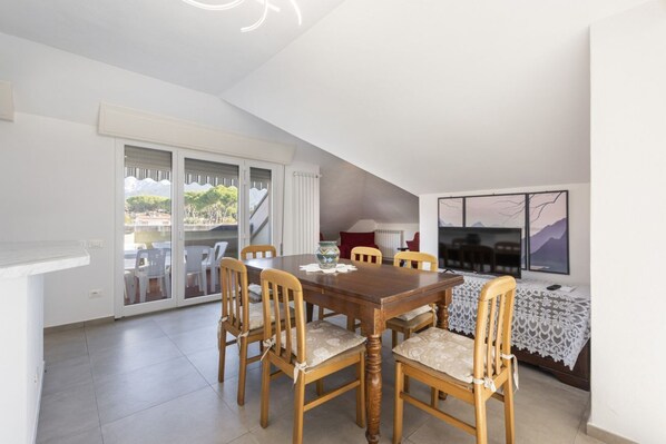 The bright living area consists of a double sofa bed, two armchairs, a dining table for 6 people, tv, and direct access to the terrace.