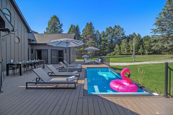 Splash in Style: Our 8'x20' pool isn't just any pool—it comes with a unique side window, adding a splash of fun to your stay! Built right into the large deck, it is just steps away from your door.